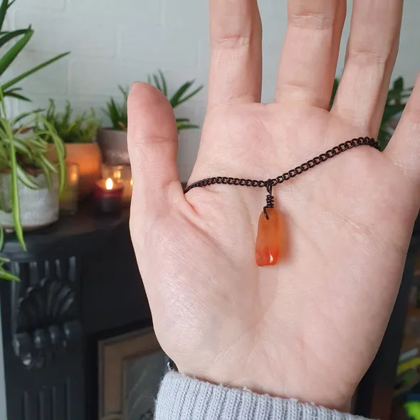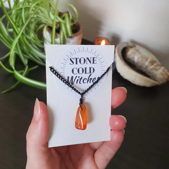 *~Hey Witches!~* Who couldn’t benefit from wearable crystal healing? Ready to light a fire in yourself and open the floodgates to creative inspiration? ~The Crystal ~Carnelian is here to get your blood pumping! This crystal will fill you with fiery energy to fuel your creativity, filling you with the confidence to see things through and hold your ground. Carnelian boosts your immune system, aids in recovery from major physical exertions, and empowers sexual energy.This beauty is perfect for...*Creativity*Confidence*Energy*Vitality~The Necklace~This piece is handmade using black chain with black lobster clasp and black tarnish-resistant wire to bind the crystal into a pendant that hangs from the chain. The necklace is approx 57cm but if you would like a bit of a variation on this length just drop me a message as all are handmade to order so adjustments can be made for you ~Please do note ~ all items are handmade upon order and as such the crystals used can all differ in size, shape and slightly in colourIf you have any questions, just drop a message!Lots of loveStone Cold Witches x